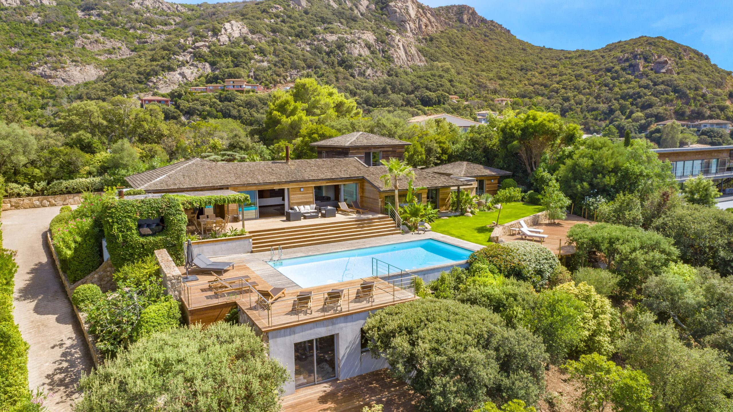 - Deux salons d’été, dont l’un abrité par une pergola avec cheminée.