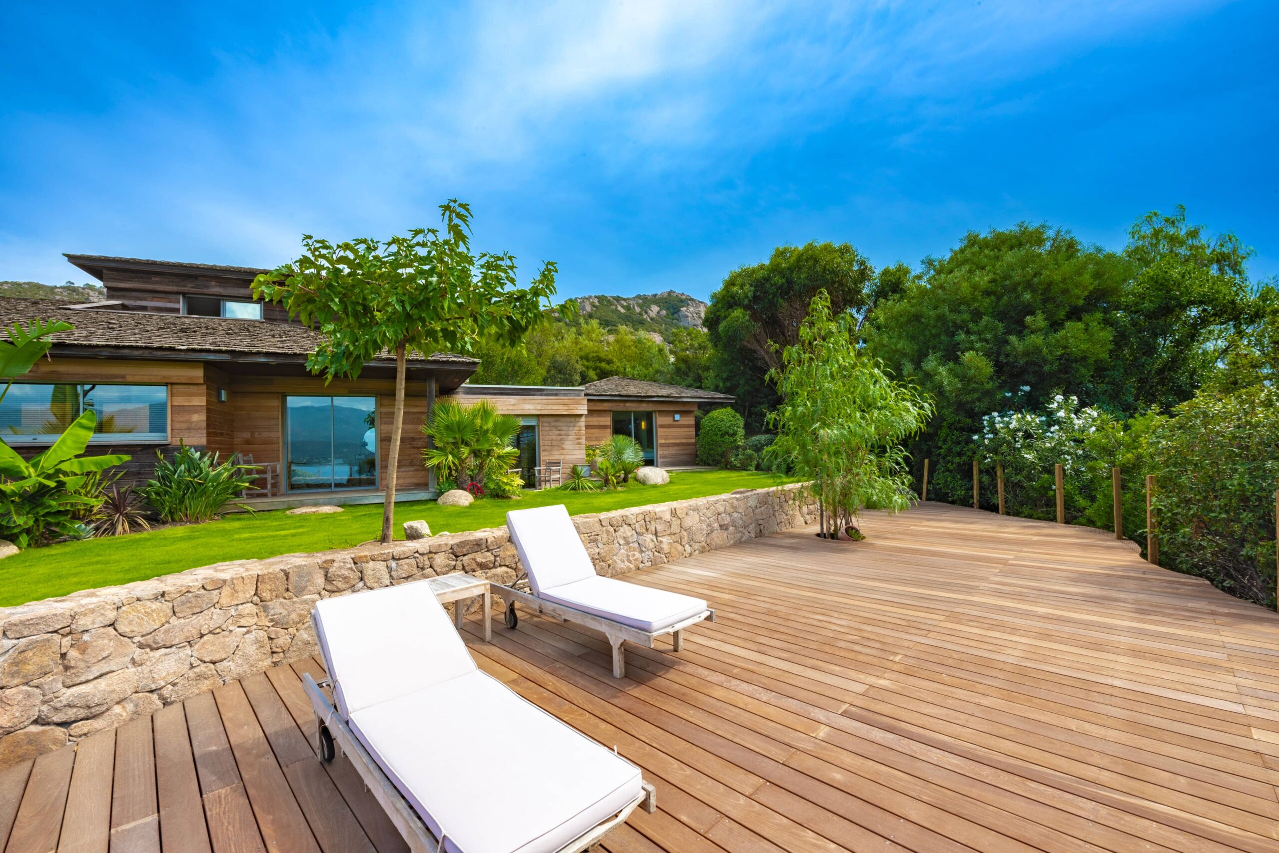 Située sur les hauteurs du golfe de Porto-Vecchio, cette belle villa contemporaine construite en Red Cedar, est entièrement climatisée.