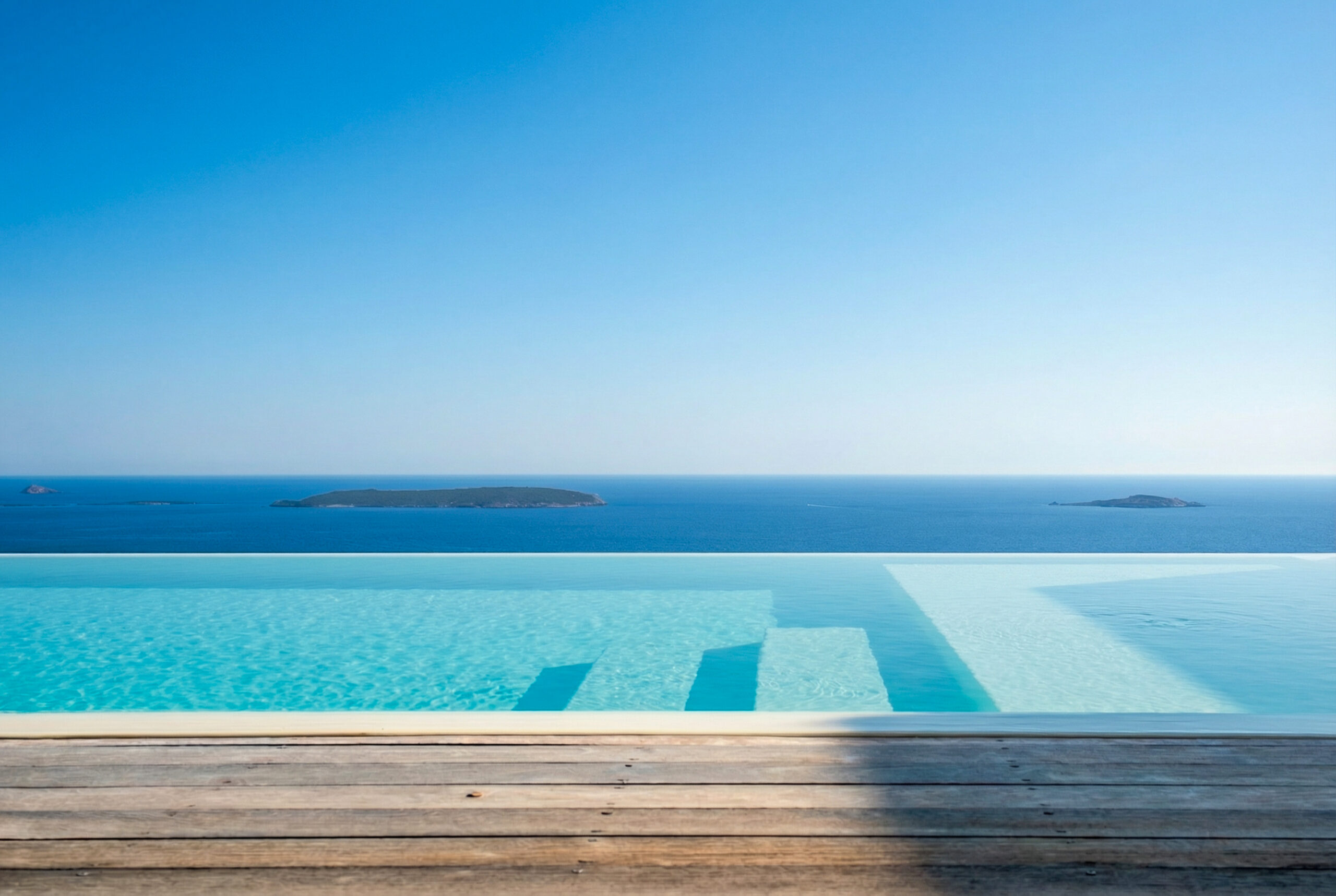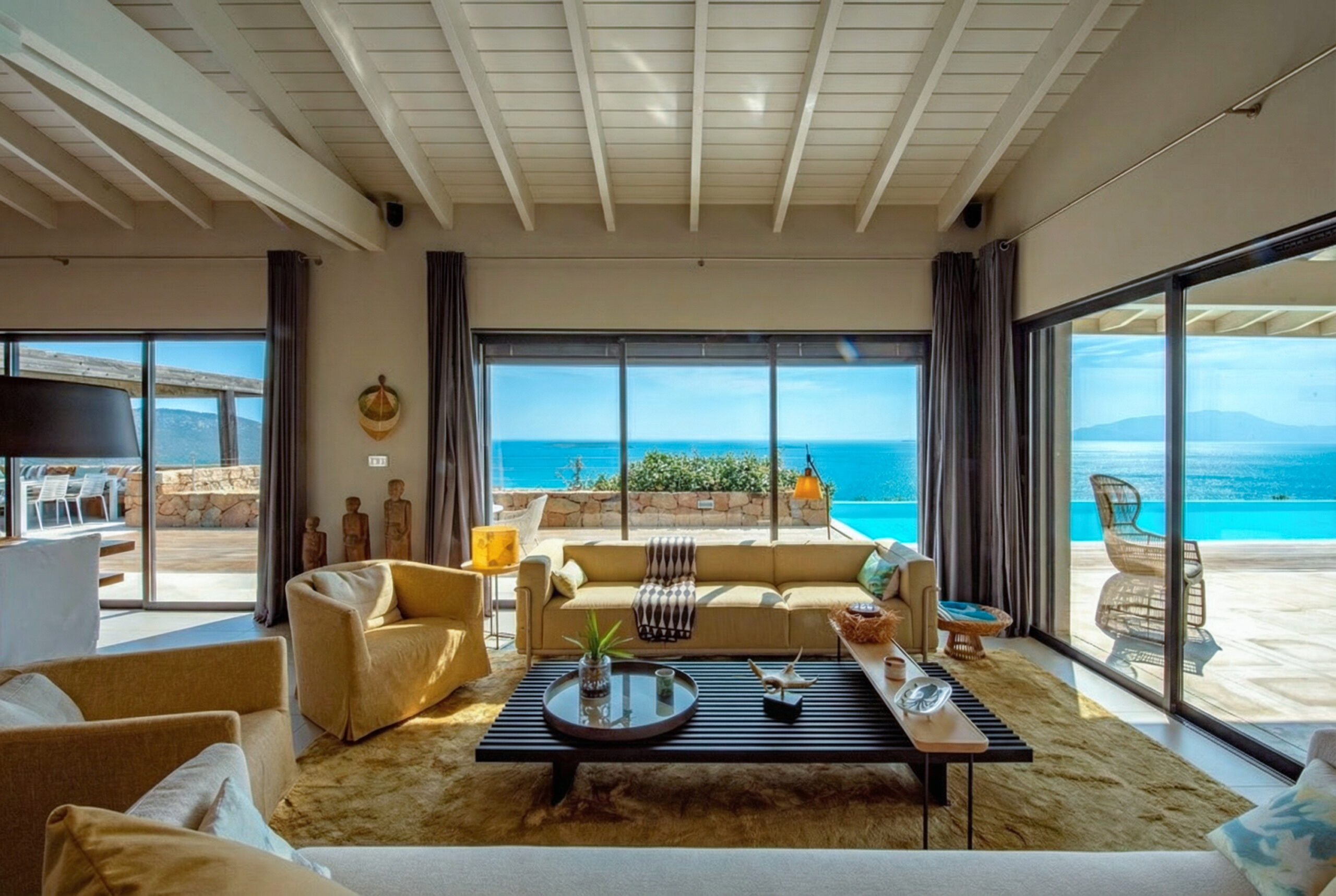 - Salon – salle à manger avec une vue sur la mer, donnant sur une vaste terrasse et sur la piscine,
