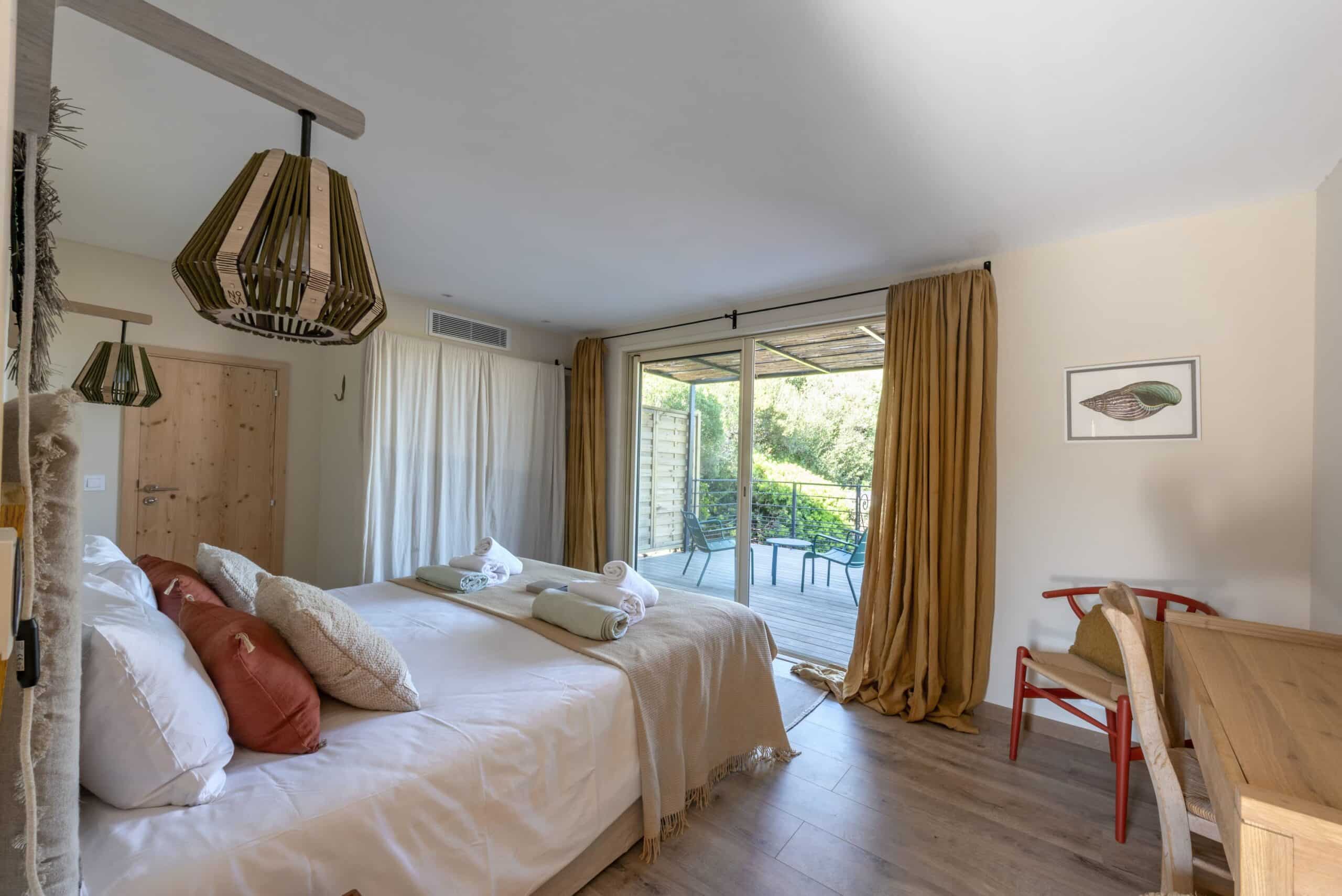 - Une suite familiale climatisée comprenant une chambre double et une chambre d’enfants avec salle d’eau et WC, terrasse privative.