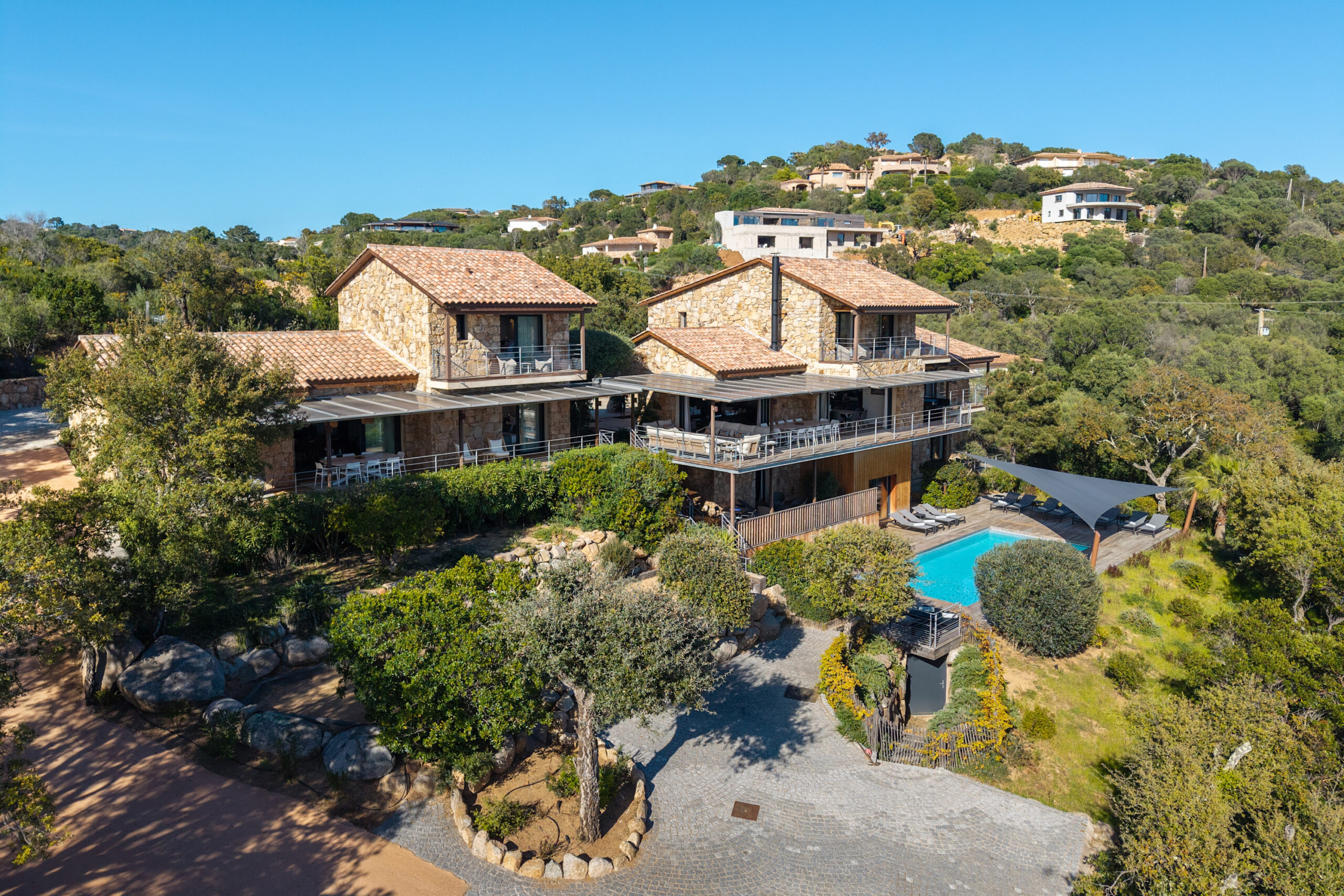 Villa à louer à Porto-Vecchio avec vue mer, 9 chambres et piscine : propriété sur les hauteurs de Saint-Cyprien, accès plage à pied, piscine chauffée 11×5 m, vastes terrasses, vue panoramique et prestations haut de gamme