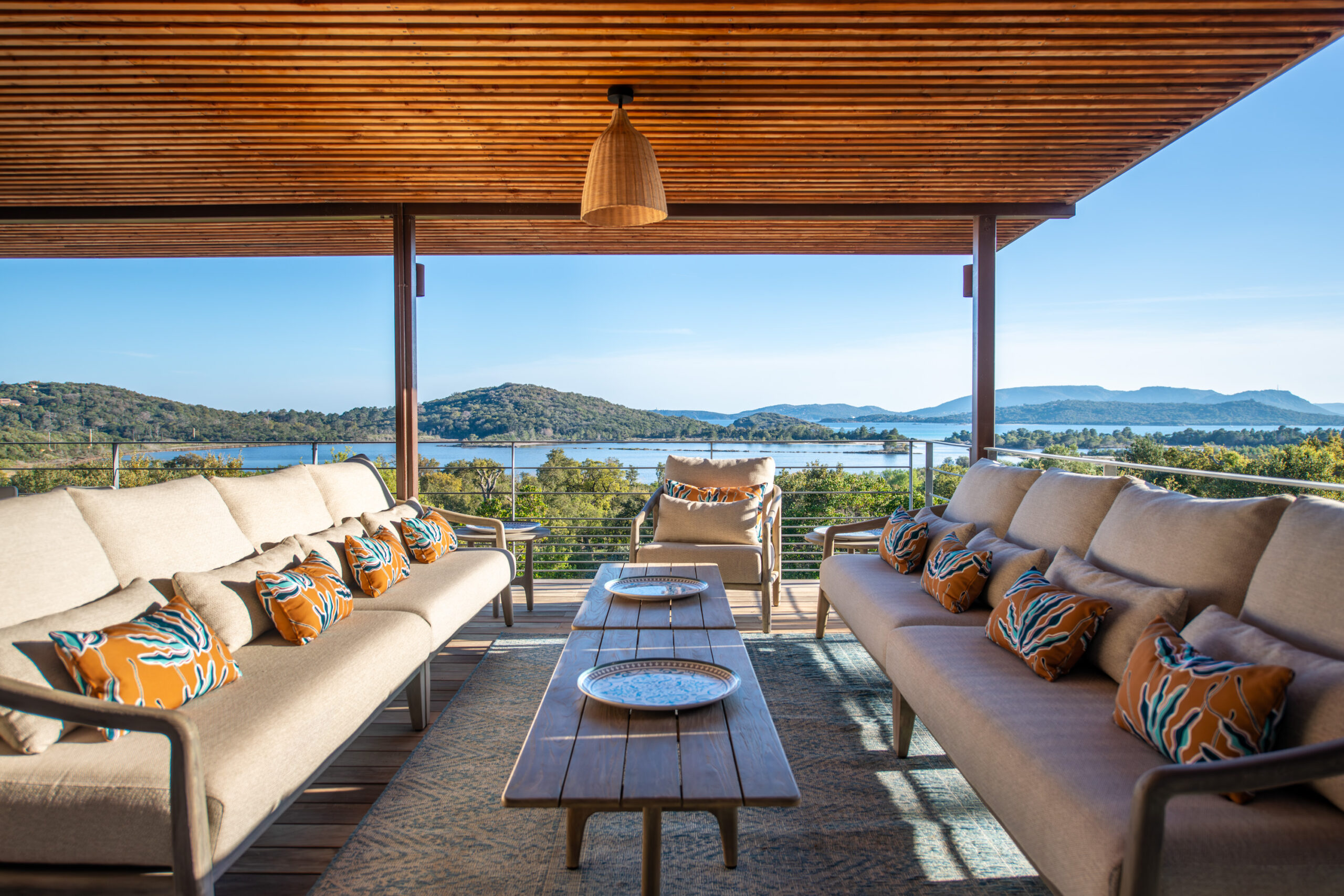 La propriété bénéficie d’une vue omniprésente sur la mer et les reliefs environnants.
