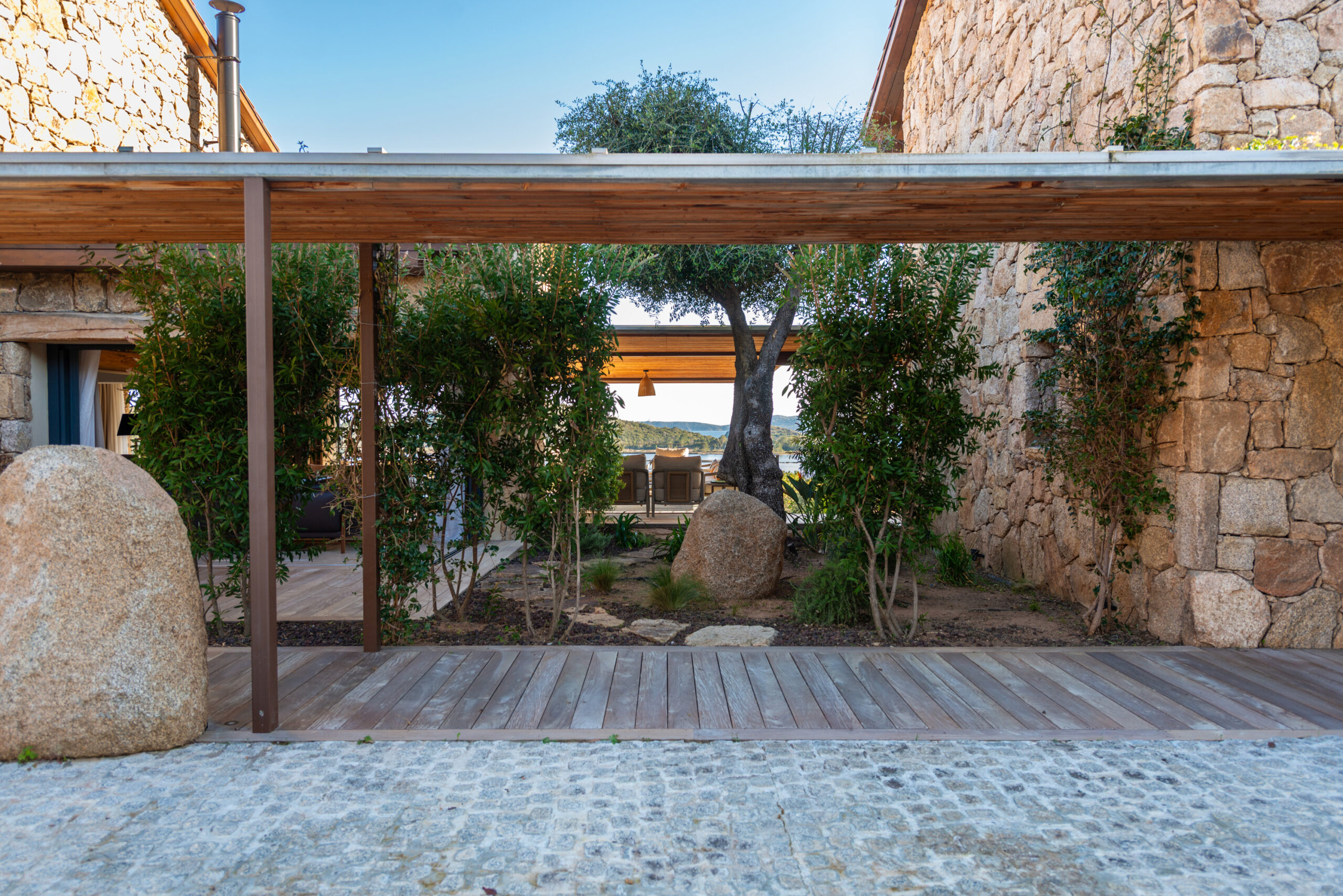 La pierre, la végétation et la lumière composent un ensemble cohérent et chaleureux.